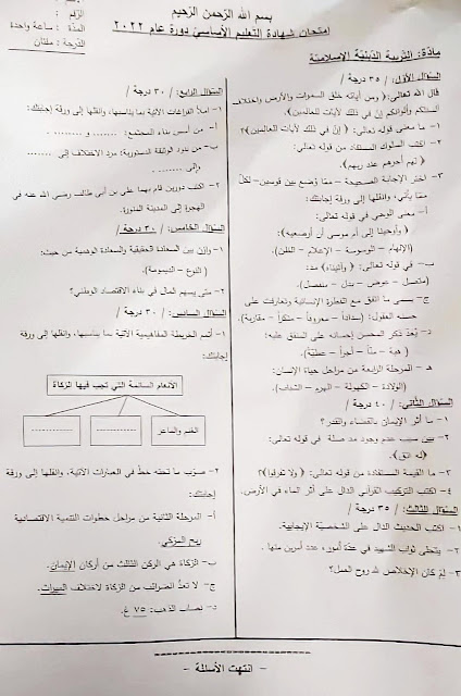 يمكن الاطلاع على أسئلة الديانة 2022 مع الحل لطلاب شهادة التعليم الأساسي في سوريا تاسع 2022